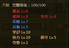 解析:根据陆逊的技能,天赋选择可以偏向“天”和“人”。8点破神和8点专攻,体现出技能的爆炸性范围伤害。特别是对重甲增加“50%”伤害,对于重骑、陷阵、西凉、重盾兵种都是致命的。5点保守和1点夺势,一旦触发,绝对可以占尽先机。其次,7点军略和5点兵备,可以提高陆逊的生存能力,一旦被敌方先释放技能,那么还有机会可以逆袭!