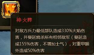 技能-神·火葬:对敌方兵力最低部队造成330%火焰伤害。并蔓延烧杀所有相邻敌军造成155%伤害,不增加士气。对重甲额外造成50%伤害